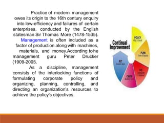 The document summarizes the key elements of marketing management. It describes marketing management as allocating organizational resources toward marketing activities and being responsible for directing marketing funds. It then outlines the four steps of the marketing management cycle: 1) planning through environmental scanning, 2) implementation by putting plans into action, 3) monitoring plans and tracking changes, and 4) correction by taking action to adjust plans based on monitoring feedback.