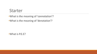 This document provides guidance on how to write paragraphs using the PEE (Point, Evidence, Explanation) structure. It explains that PEE allows for structured writing and ensures good answers. It defines connotation and denotation. Examples are given of using PEE to analyze how presentational devices in advertisements aim to persuade audiences, including discussing the use of color and images. Students are prompted to practice writing their own PEE paragraphs analyzing persuasive techniques in examples provided.