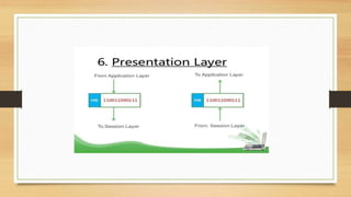 Dokumen ini menjelaskan model referensi OSI yang terdiri dari tujuh lapisan, mulai dari Physical Layer yang mengelola koneksi fisik hingga Application Layer yang berfungsi sebagai interaksi antara aplikasi dan jaringan. Masing-masing lapisan memiliki perangkat dan fungsi spesifik, seperti hub dan switch di Data Link Layer serta router di Network Layer. Contoh protokol yang digunakan pada Application Layer termasuk HTTP dan FTP, yang memungkinkan komunikasi dan transfer data antar aplikasi di jaringan.