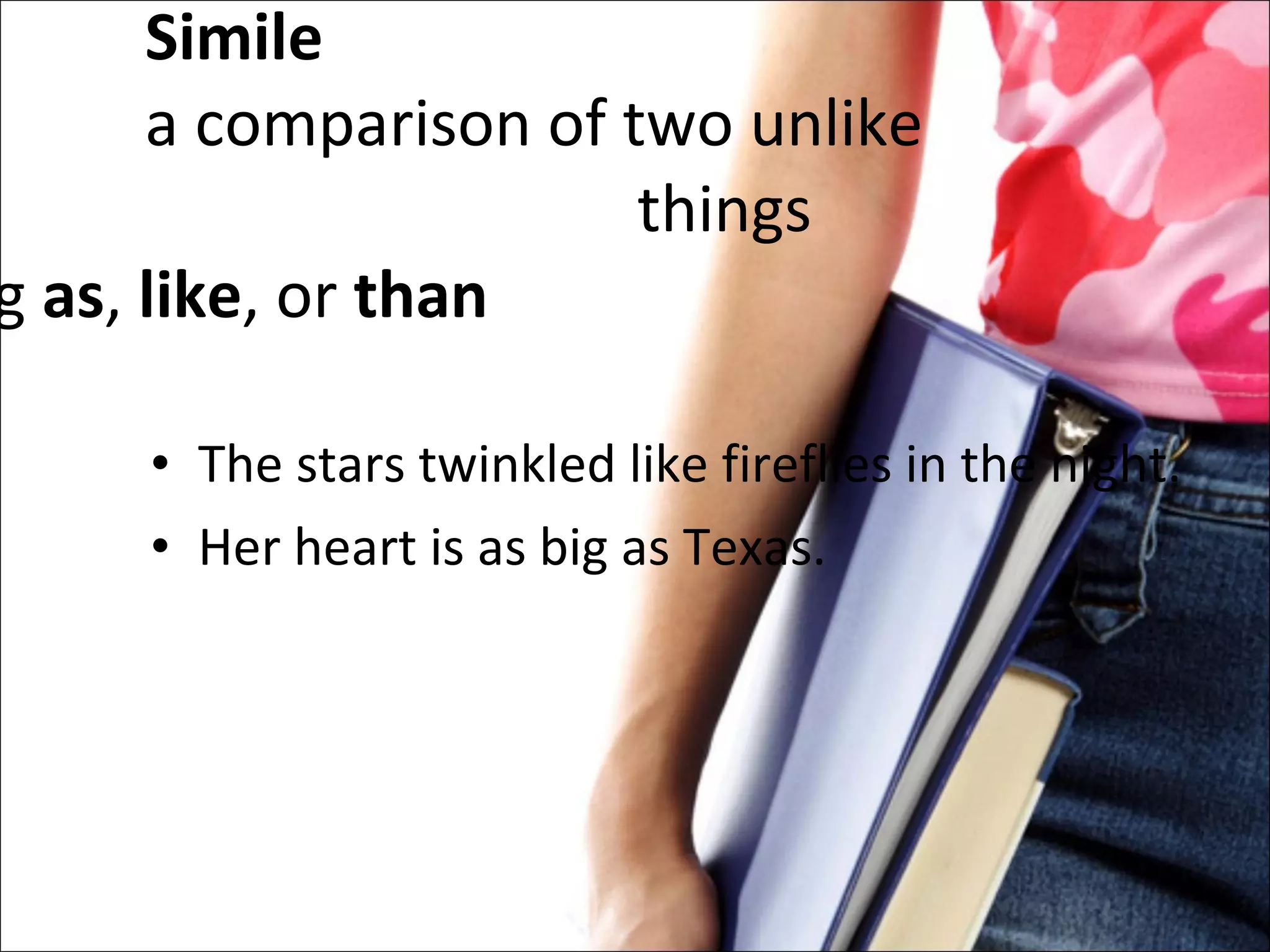This document provides examples of different types of figurative language including simile, metaphor, personification, alliteration, apostrophe, onomatopoeia, hyperbole, puns, anachronisms, and anthropomorphism. It includes short quotes and passages that demonstrate each technique through the use of descriptive language, comparisons, repetition of sounds, and attribution of human qualities.