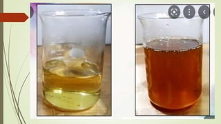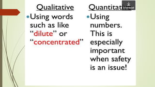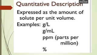 The concentration of a solution refers to the amount of solute dissolved in a given amount of solvent. It can be expressed as a percentage by mass by taking the ratio of the mass of the solute to the total mass of the solution and multiplying by 100. Examples are provided to demonstrate calculating concentration as a percentage by mass using various masses of solutes and solvents in solutions.