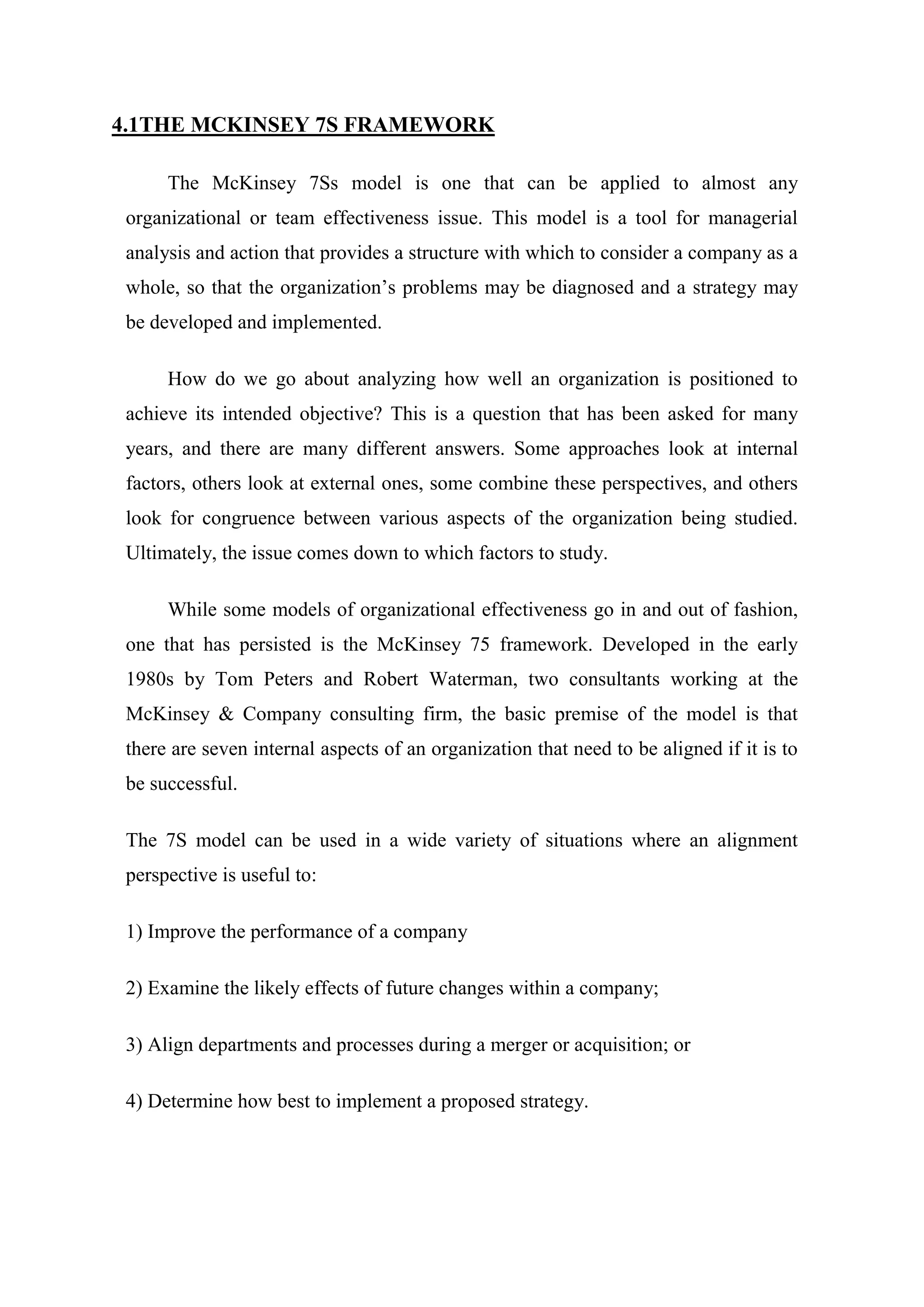 The document discusses the McKinsey 7S framework, which analyzes seven internal factors ("hard" and "soft" elements) that must be aligned for an organization to be successful. The hard elements are strategy, structure, and systems, which management can directly influence. The soft elements are shared values, skills, style, and staff, which relate to culture and are more difficult to define. All elements are interrelated, so a change in one affects the others. The framework can be used to diagnose organizational problems, develop strategy, and ensure changes in one area consider wider impacts.