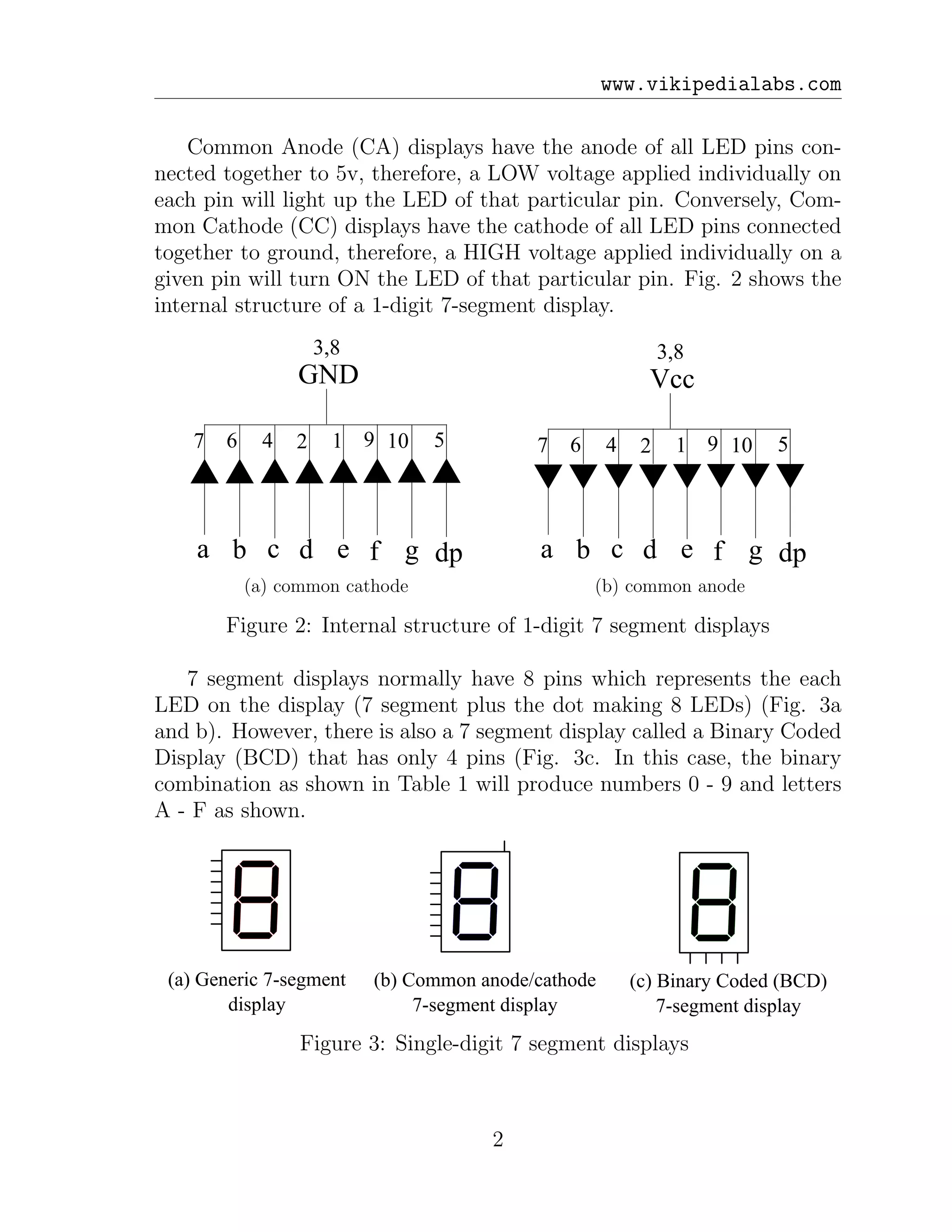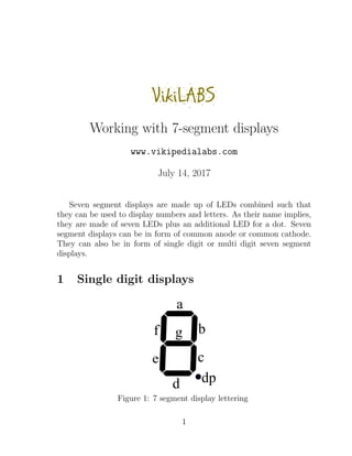 Seven segment displays use LEDs arranged in a pattern to display numbers and some letters. They are made up of 7 LED segments plus an optional decimal point LED. They can be configured as either common anode or common cathode. Multi-digit displays have additional pins to control each digit independently compared to single digit displays. A latch IC can be used to reduce the number of microcontroller pins needed to drive multi-digit seven segment displays.