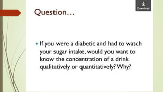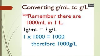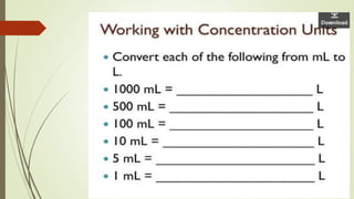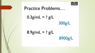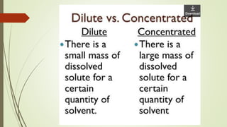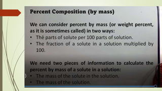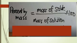 The concentration of a solution refers to the amount of solute dissolved in a given amount of solvent. It can be expressed as a percentage by mass by taking the ratio of the mass of the solute to the total mass of the solution and multiplying by 100. Common examples provided calculate the concentration of solutions based on the given masses of solute and solvent/solution.