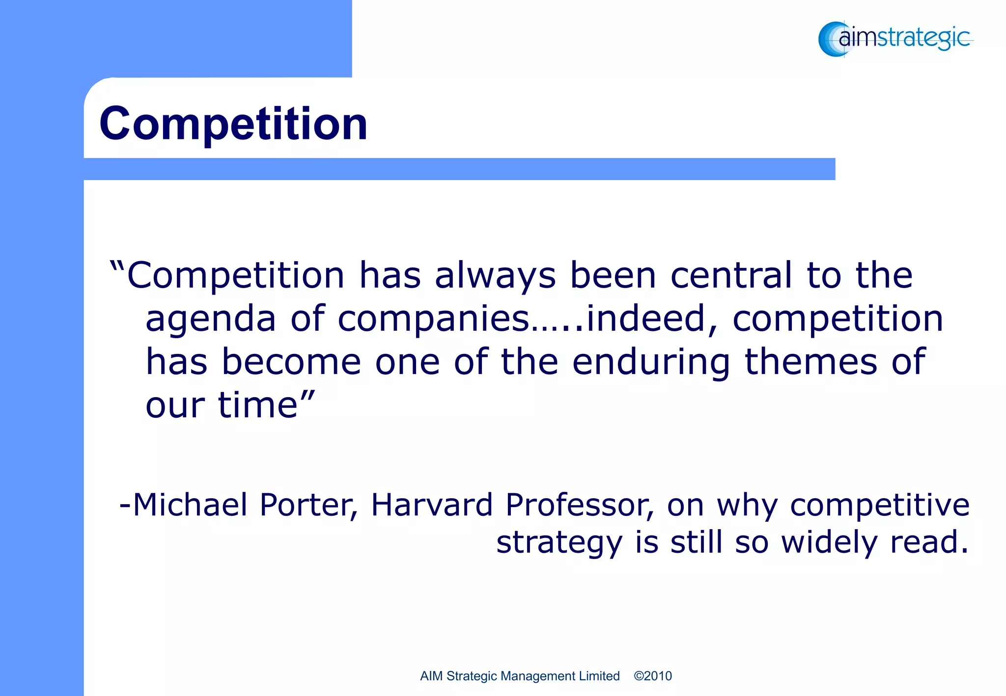 Competitive intelligence involves systematically gathering and analyzing external information about competitors to support strategic decision making and protect an organization. It helps evaluate performance, identify competitor strengths and weaknesses, and support innovation. Unlike business intelligence which focuses internally, competitive intelligence requires researching competitors directly through public sources and third parties to gain a comprehensive understanding of the competitive landscape. Formal competitive intelligence programs follow a cycle of defining intelligence needs, collecting relevant information, analyzing it, and sharing findings across an organization.