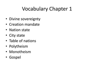The document summarizes key events and concepts from early human history according to the biblical creation narrative. It describes how God created the world in 6 days and created humans, Adam and Eve, to rule over the earth. It then discusses how sin entered the world through Adam and Eve disobeying God, the effects of that first sin on humanity, and God's plan for redemption through the seed of the woman. The summary then outlines major biblical figures and events that followed, including Cain and Abel, the great flood in Noah's time, the Tower of Babel, and the resulting formation of nations and language groups across the earth.
