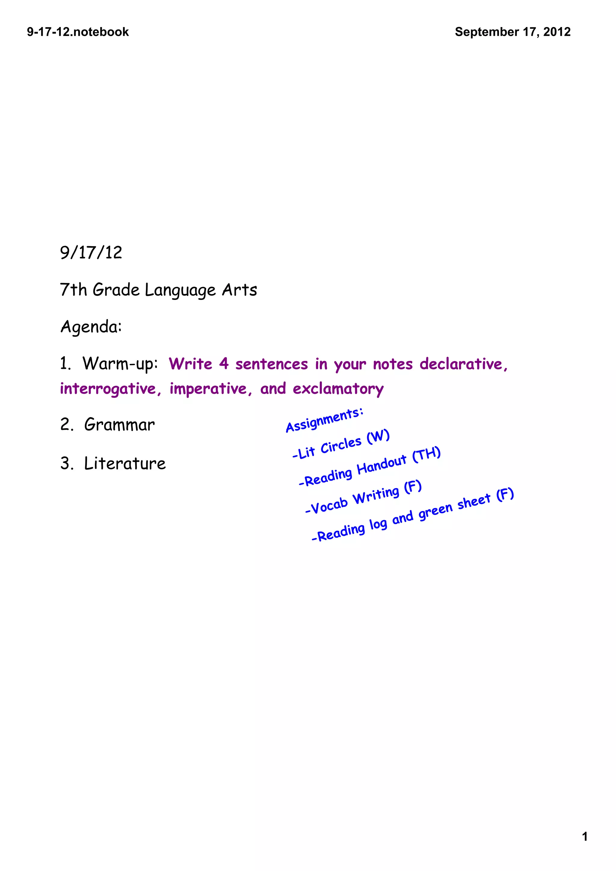 The document outlines the agenda for a 7th grade language arts class. It includes assignments on grammar, literature, and reading skills. For grammar, the class will discuss kinds of sentences and subjects in unusual positions. They will also analyze sentences from a passage about Williamsburg, Virginia. For literature, the class will read about reading comprehension skills like making inferences, drawing conclusions, comparing/contrasting, and evaluating. The reading section provides tips for actively reading like focusing, taking notes, asking questions, and finding a good place to read.