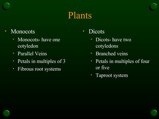 The document discusses the differences between monocots and dicots. It provides examples of monocots like grasses and lilies that have parallel veins, petals in multiples of three, and fibrous root systems. Dicots make up three-fourths of flowering plants and have examples like buttercups and mint. They have branched veins, petals in multiples of four or five, and a taproot system. Specific families of monocots like the lily family and grass family are also described.