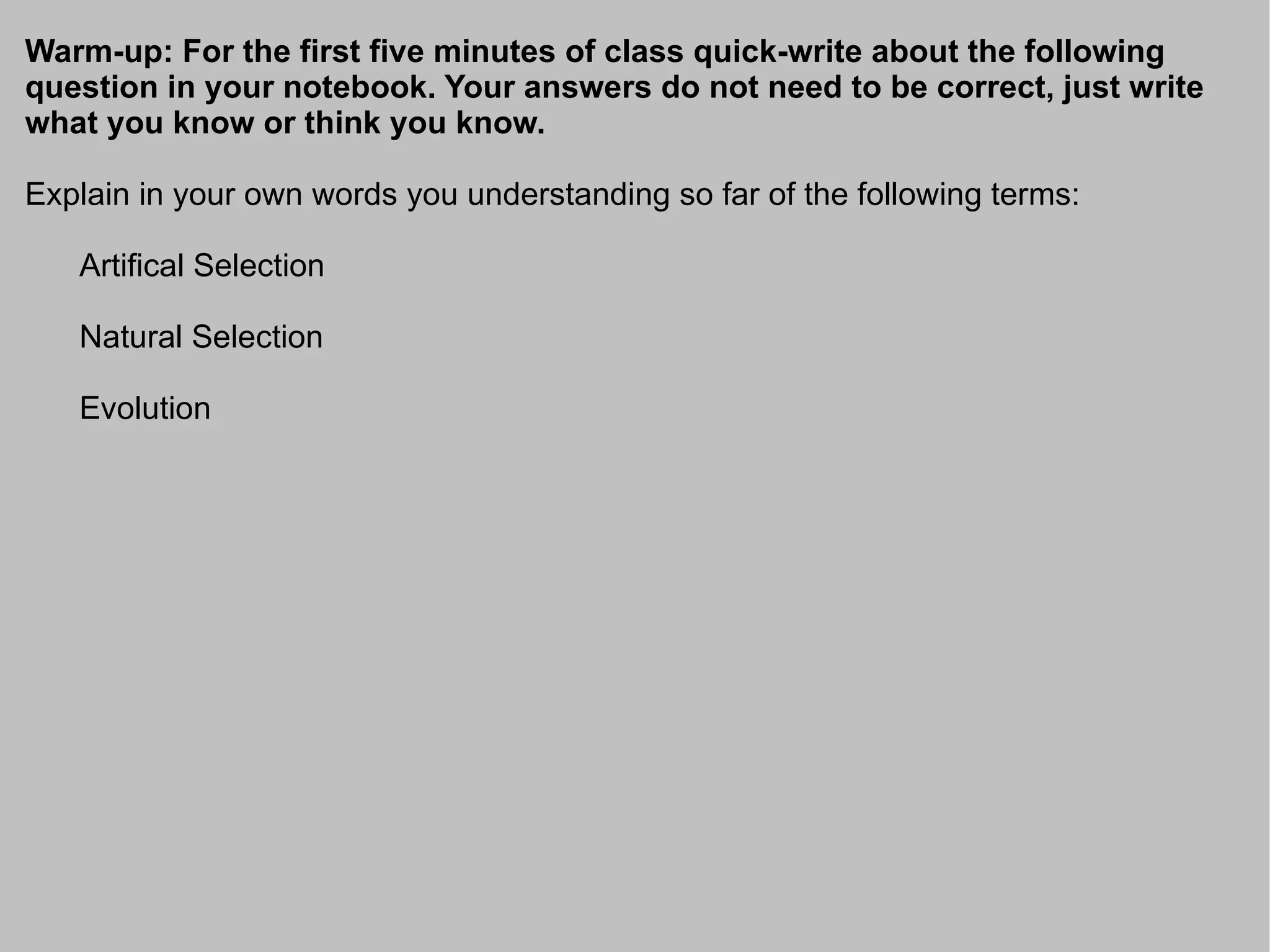 1) Natural selection and artificial selection lead to gradual changes in species over time as organisms adapt to their environments.