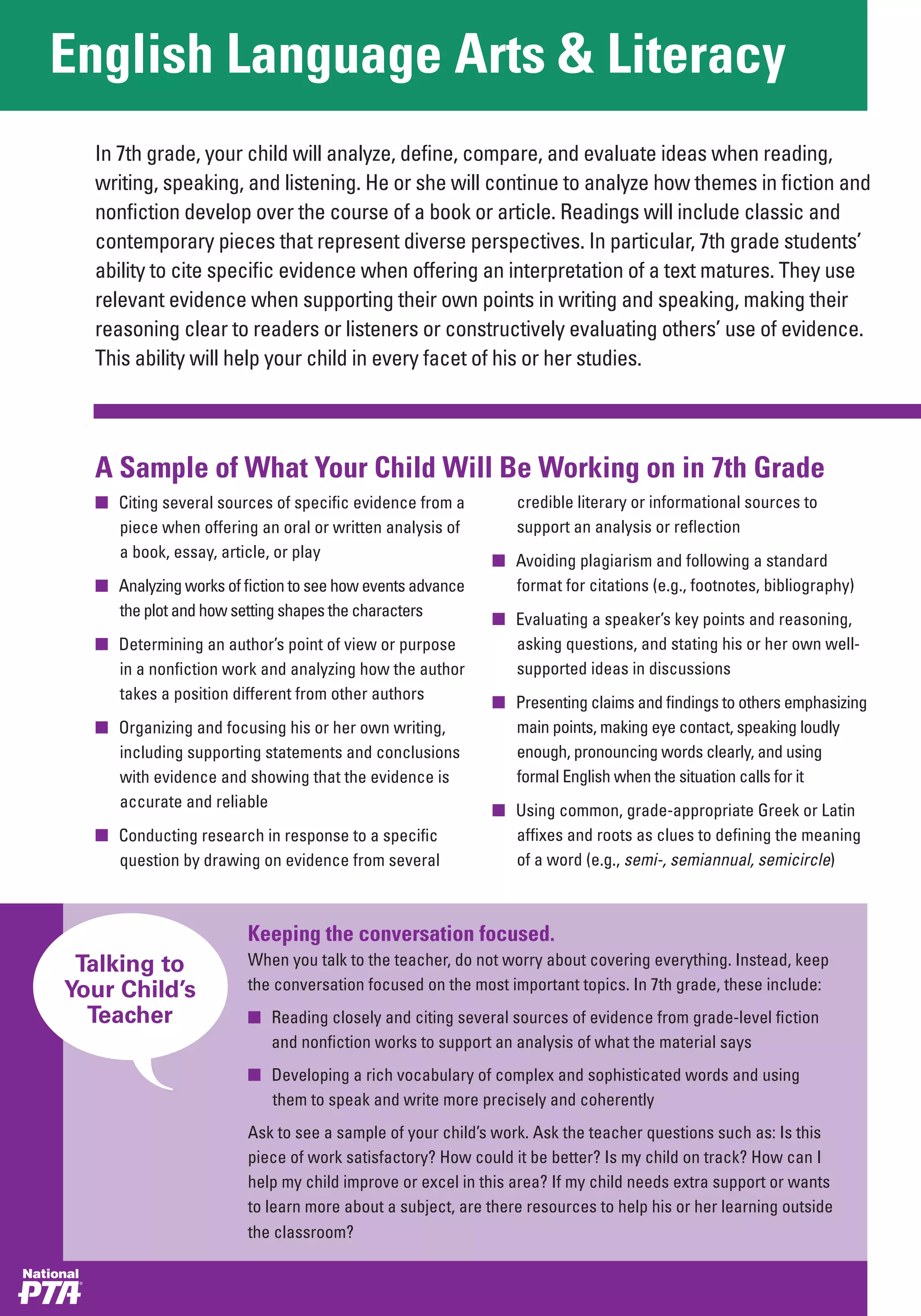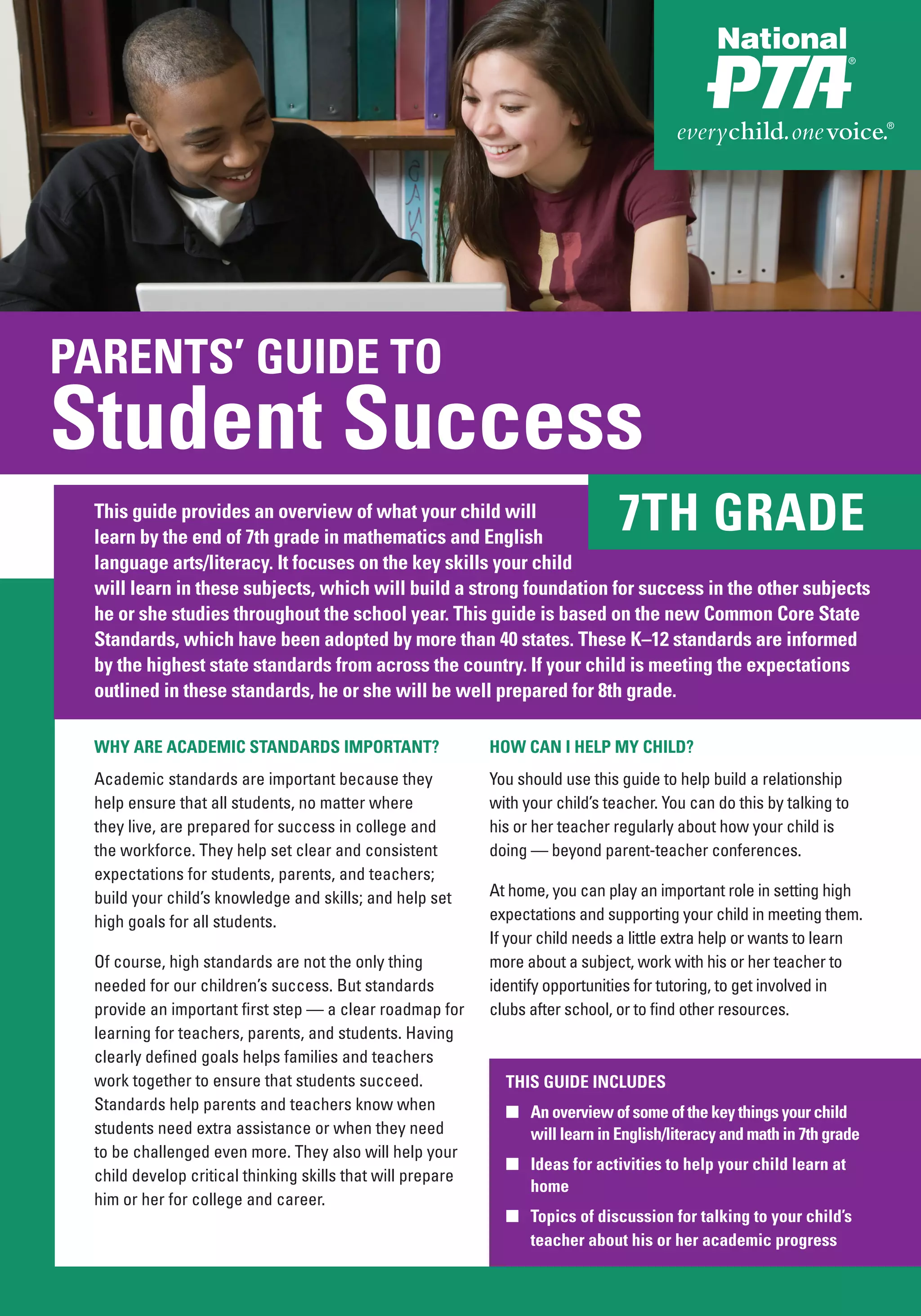 This guide outlines the key skills 7th-grade students will learn in mathematics and English/language arts, adhering to the Common Core state standards adopted by many states. It emphasizes the importance of academic standards for preparing students for college and the workforce while providing parents with resources to support their children's education. The document also offers specific learning objectives, discussion topics for parents to engage with teachers, and strategies for fostering home learning.