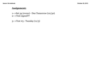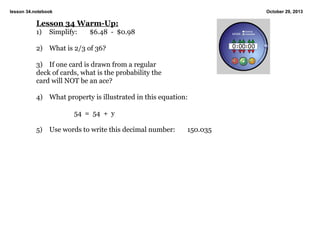 1) The document contains notes from a math lesson. It lists an assignment that is due the next day and informs students of an upcoming test. 2) The warm-up questions cover basic math skills like simplifying expressions, fractions, probability, properties of equations, and writing out decimals. 3) The lesson explains that tenths on a number line or ruler refer to the marks that divide the distance between two numbers into 10 equal parts. It provides examples of locating tenths on a number line.