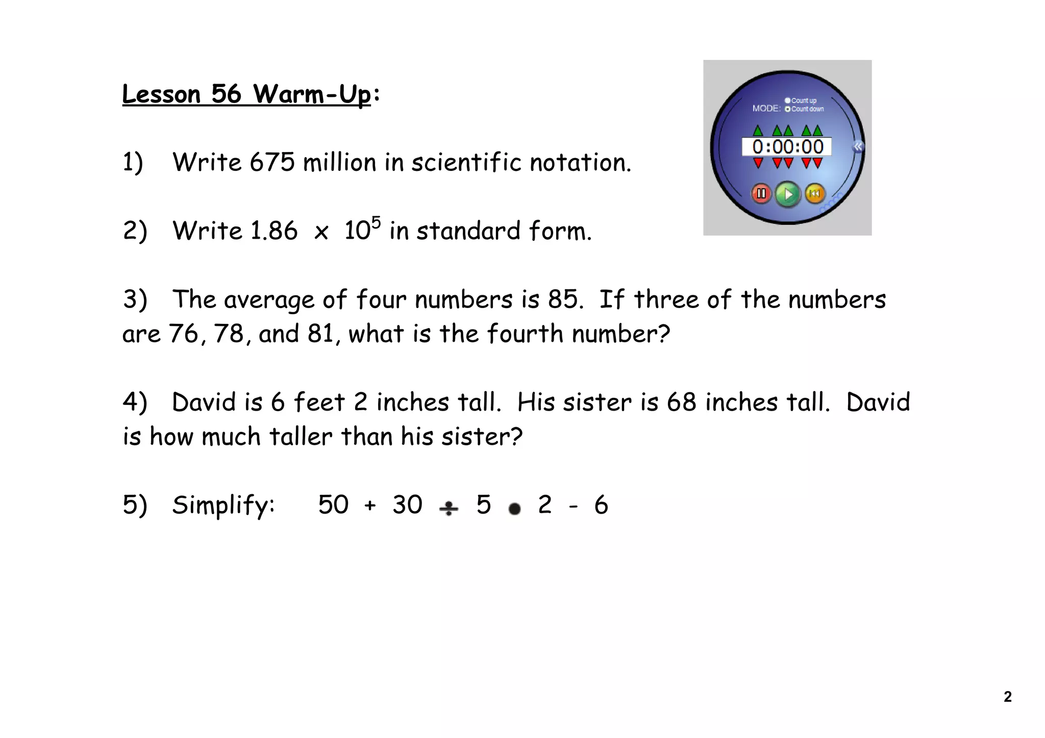 1) An assignment is due tomorrow that includes Set 56 (evens) and a Test #9 on Friday. Students are also reminded to floss. 2) A warm-up includes writing numbers in scientific and standard form, finding the average of four numbers where three are given, comparing heights in feet and inches, and simplifying an expression. 3) An upcoming lesson defines functions as rules relating two sets of numbers and includes examples of functions.