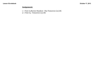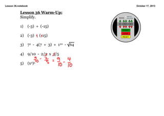 1. The document contains notes from a math lesson on simplifying expressions with integers and exponents. 2. It includes practice problems for students to simplify expressions involving multiplication, division, exponents, and combining like terms. 3. The lesson notes also provide rules for multiplying and dividing integers.