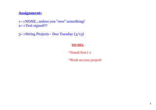 The document outlines assignments and steps for a string project that is due on Tuesday, March 13th. Students are instructed to come up with an idea for the project, get approval from Mrs. D, and tape their idea to the back of cardstock paper. They then need to poke holes in the paper and sew about a yard of thread through the holes to complete the project. Students are reminded to return needles and clean up any stray thread.