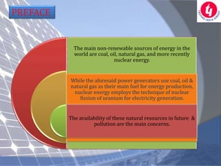 This document presents a project on a solar tracking system developed by a group of students. It discusses how solar tracking can increase solar panel output by ensuring the panels always face the sun. It includes block diagrams of the system design using a microcontroller and sensors to control stepper motors and adjust the panel orientation. The document also discusses the concept design, Pro-E CAD model, design evaluation, and applications of the solar tracking system.