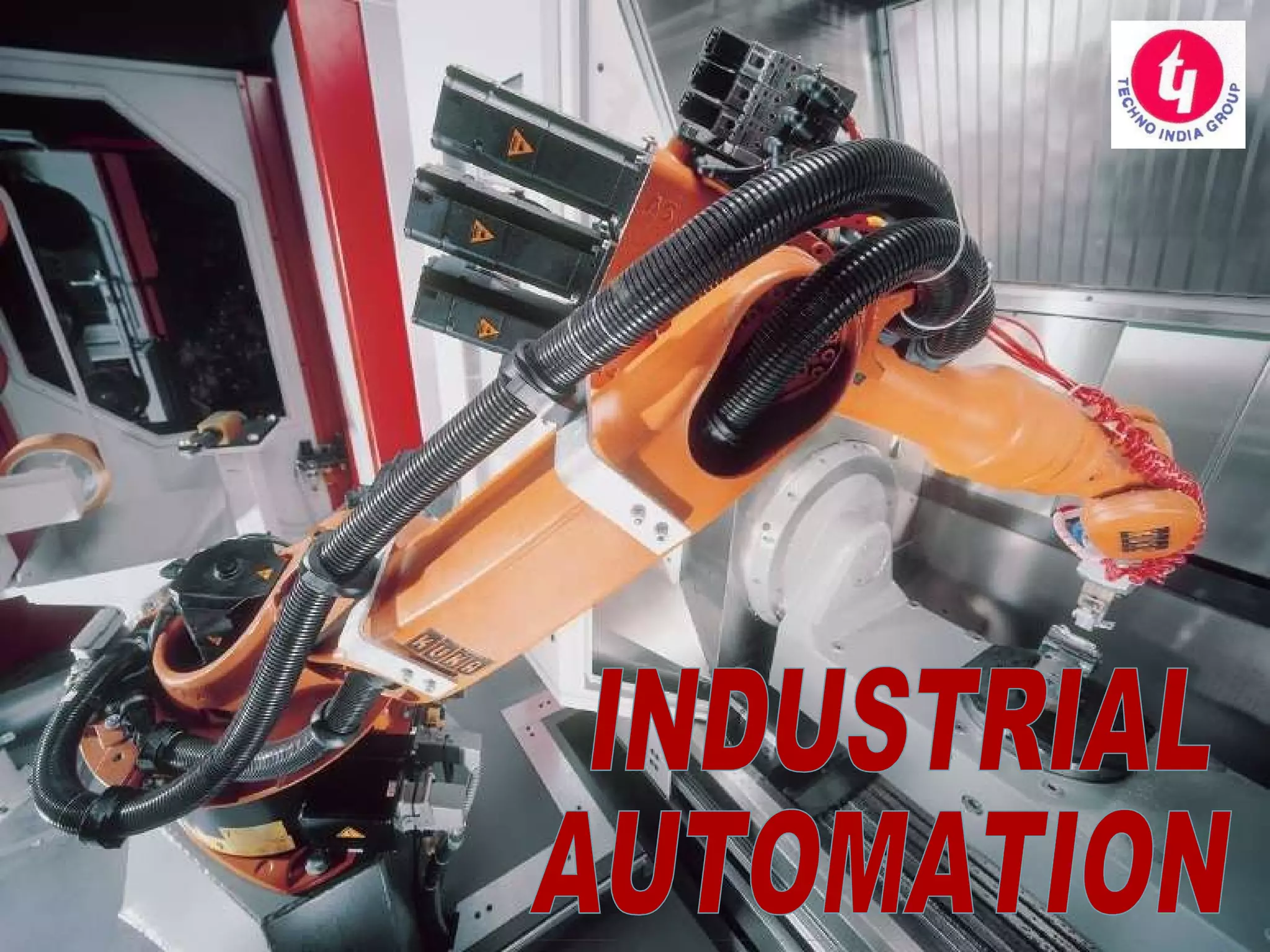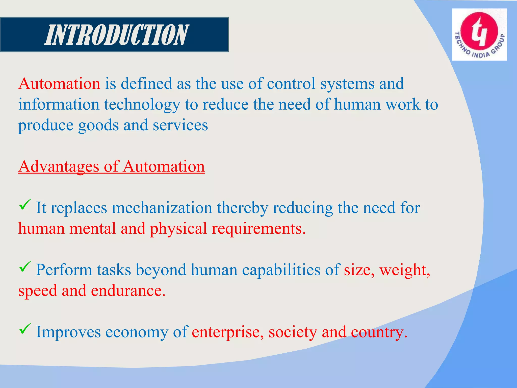 The document discusses industrial automation and its various types. It defines automation as using control systems and information technology to reduce human work in producing goods and services. Some key advantages are replacing human physical and mental requirements, performing tasks beyond human capabilities, and improving economic efficiency. The document also describes various automated control systems like electronic, pneumatic, and computer-aided automation. It provides details on distributed control systems, programmable logic controllers, robotic arms, and concludes that while automation increases precision and speed, its heavy costs and potential job losses must also be considered.
