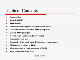Total Quality Management (TQM) is a management approach focused on meeting customer needs through continuous improvement. The document discusses TQM principles like focusing on customer satisfaction, continuous improvement, and teamwork. It outlines Deming's 14 points for TQM implementation and characteristics of successful TQM companies like training employees and using teams for process improvement. Reasons for companies to begin TQM include increased efficiency and motivation. Examples of companies that implemented continuous improvement through TQM are provided.