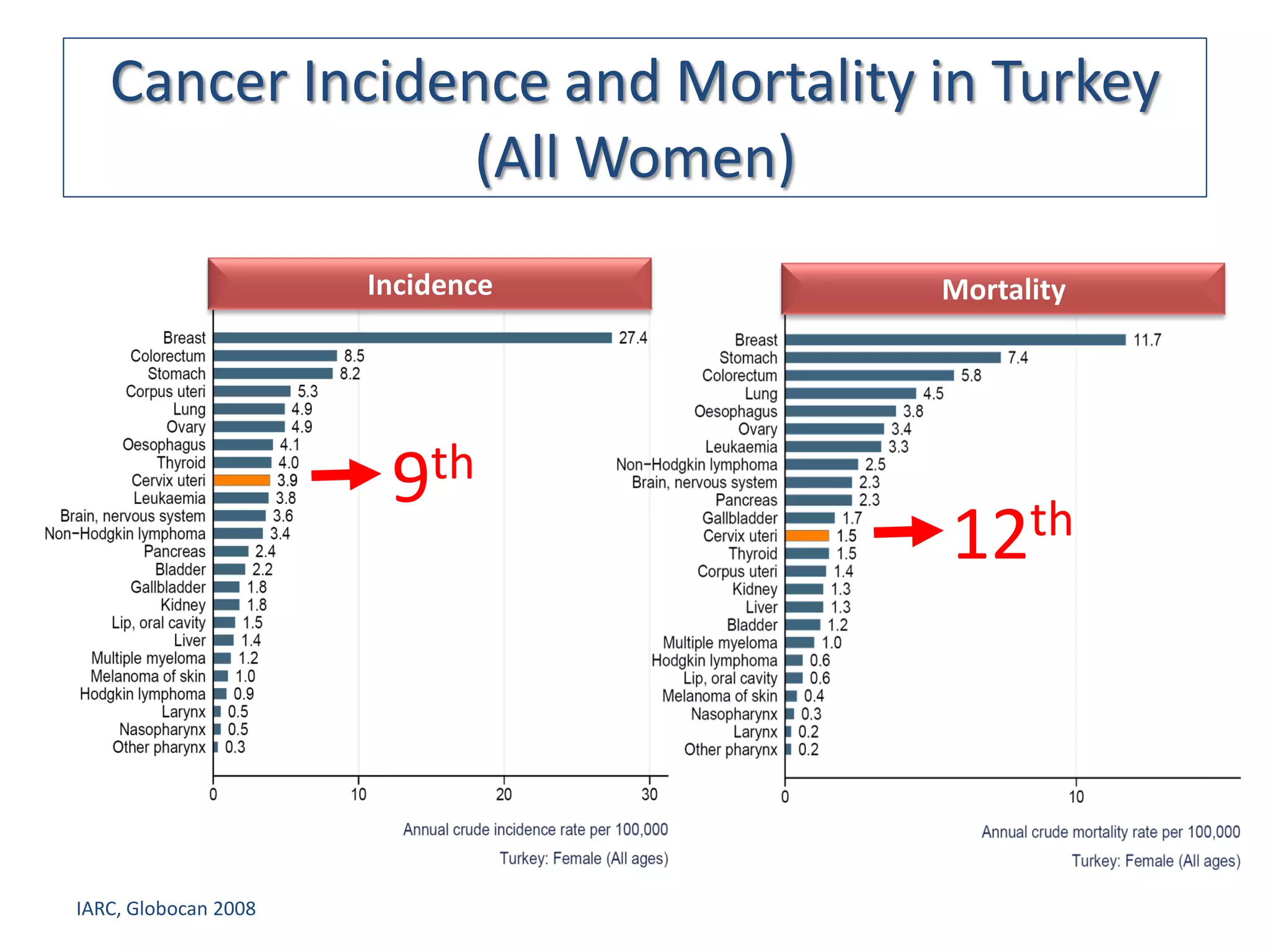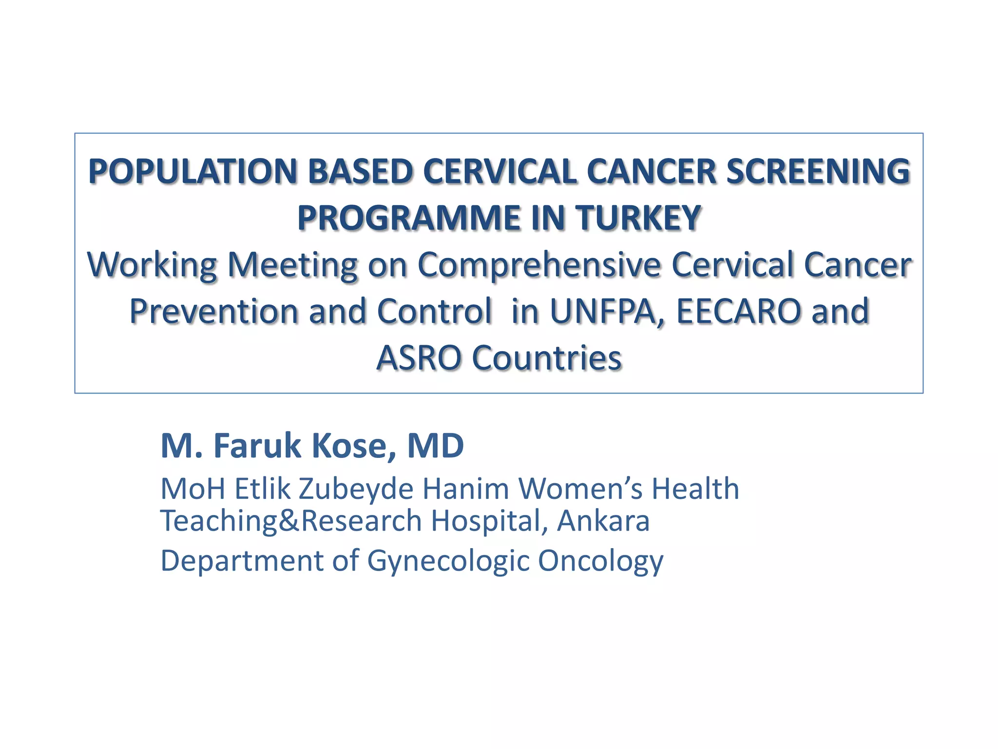 The document discusses population-based cervical cancer screening in Turkey. It finds that cervical cancer is the 7th most common cancer in women in Turkey, with an estimated 1,443 new cases and 556 deaths annually. While Turkey has a national screening program, coverage is only around 20%. The document evaluates moving to HPV testing as the primary screening method, which could increase sensitivity and allow for longer screening intervals compared to traditional cytology-based screening. Overall, the document advocates for expanding and improving Turkey's cervical cancer screening program through increased uptake of HPV testing.