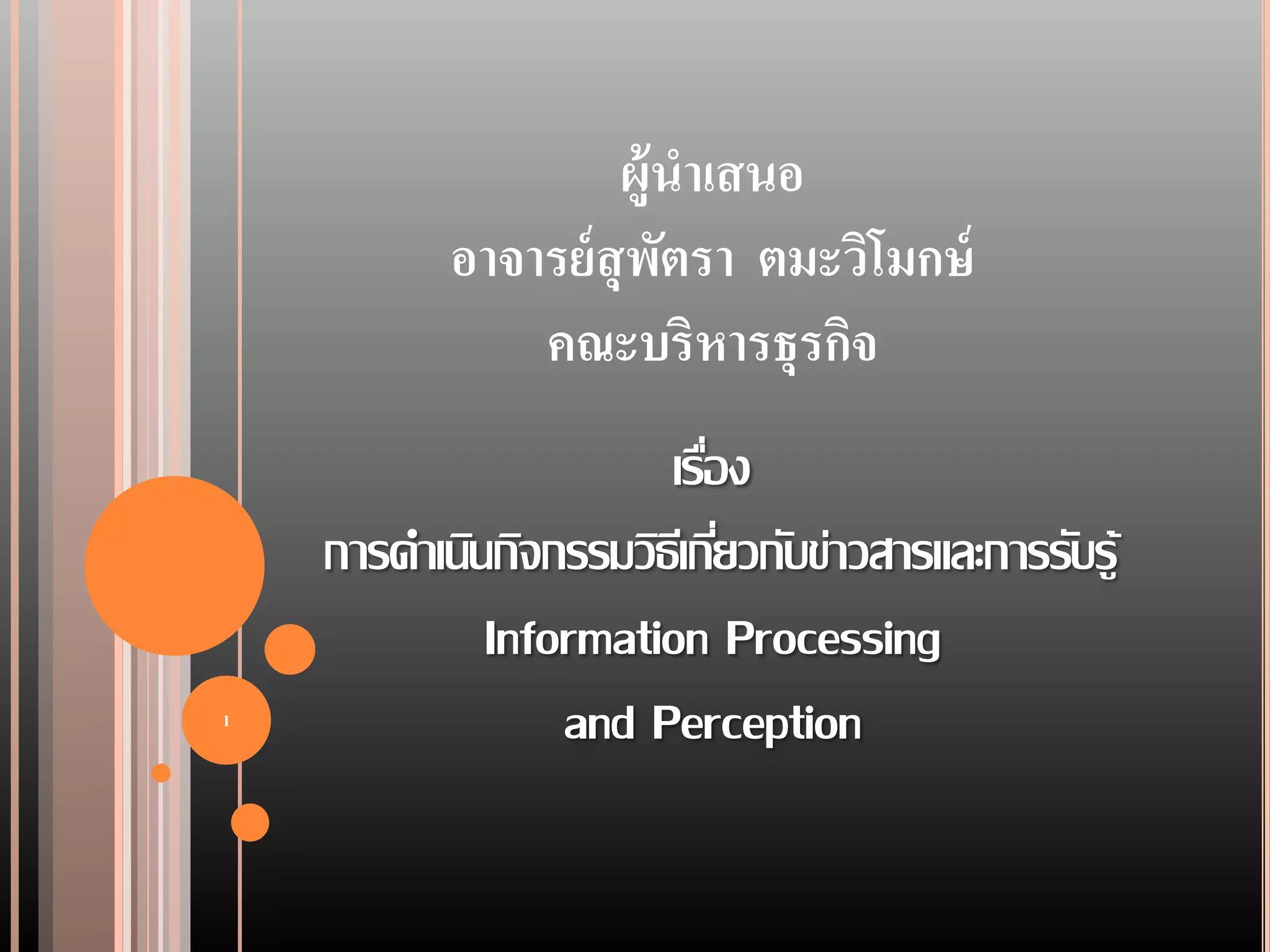 อาจารย์ สุพตรา ตมะวิโมกษ์ ั คณะบริหารธุรกิจ เรือง ่ การดาเนินกิจกรรมวิธเี กียวกับข่าวสารและการรับรู้ ่ Information Processing 1 and Perception