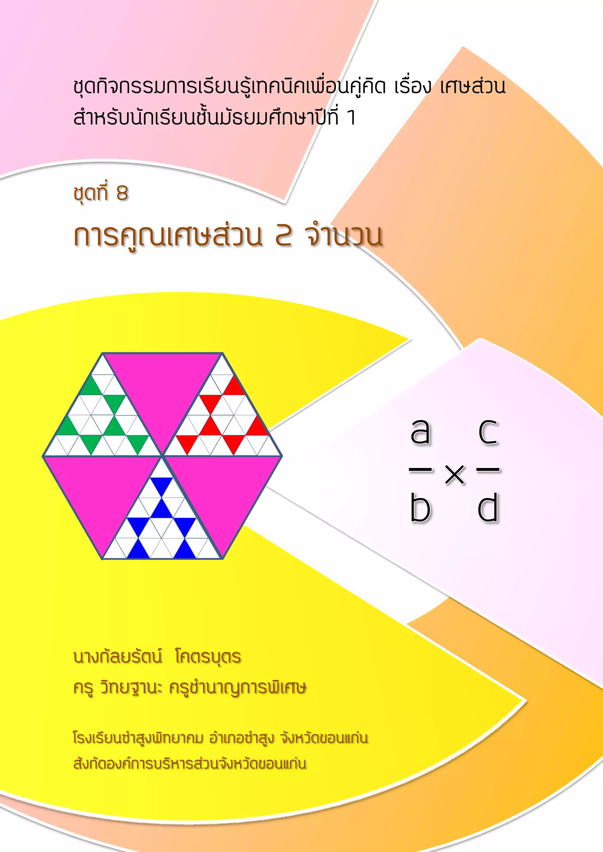 ชุดกิจกรรมการเรียนรู้วิชาคณิตศาสตร์ เรื่อง เศษส่วน โดยใช้เทคนิคการเรียนรู้แบบเพื่อนคู่คิด สำหรับนักเรียนชั้นมัธยมศึกษาปีที่ 1 ให้นักเรียนได้ทำงานเป็นรายบุคคล เป็นคู่และเป็นกลุ่ม เน้นให้นักเรียนได้คิด วิเคราะห์ แก้ปัญหา กระบวนการกลุ่ม การช่วยเหลือซึ่งกันและกัน