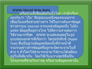 เรามักเรียก ย่อๆกันว่า “เว็บ” คือรูปแบบหนึ่งของระบบการ เชื่อมโยงเครือข่ายข่าวสาร ใช้ในการค้นหาข้อมูล ข่าวสารบน Internet จากแหล่งข้อมูลหนึ่ง ไปยัง แหล่ง ข้อมูลที่อยู่ห่างไกล ให้มีความง่ายต่อการ ใช้งานมากที่สุด WWW จะแสดงผลอยู่ในรูป แบบของเอกสารที่เรียกว่า ไฮเปอร์เท็กซ์ (Hyper Text) ซึ่งเป็นฐานข้อมูลชนิดหนึ่งที่ทำาหน้าที่ รวบรวมข่าวสารข้อมูลที่อยู่กระจัดกระจายในที่ ต่าง ๆ ทั่วโลกให้สามารถนำามาใช้งานได้เสมือน อยู่ในที่เดียวกัน โดยใช้เว็บเบราเซอร์ซึ่งเป็น โปรแกรมที่ช่วยในการดู หรืออ่านข้อมูลเหล่านั้น