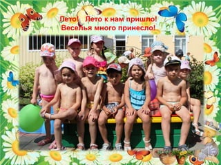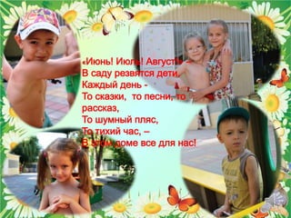 Документ описывает радостные моменты детства и летних приключений группы детей, которые участвуют в различных играх, занятиях и праздниках. Они занимаются физкультурой, математикой, работают в огороде и отмечают дни рождения, создавая теплую и дружелюбную атмосферу. В конце они сожалеют о быстром уходе лета и выражают надежду на лучший будущий опыт в школе.