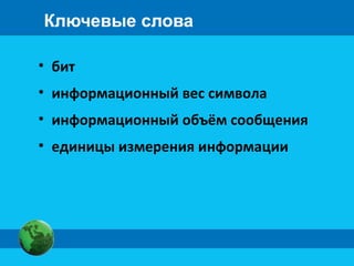 Документ объясняет основные концепции измерения информации, включая информационный вес символа и объем сообщения. Он описывает алфавитный подход к измерению информации и предоставляет задачи для практического применения этих концепций. Основные единицы измерения информации, такие как бит и байт, также обсуждаются в контексте их взаимосвязи.