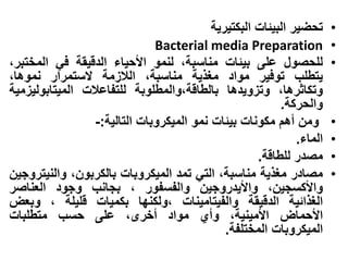 يتناول الوثيقة تحضير البيئات البكتيرية اللازمة لنمو الأحياء الدقيقة في المختبر، مشتملاً على مكونات مثل الماء ومصادر الطاقة والعناصر الغذائية المختلفة. يتضمن أيضاً أنواع البيئات المغذية، مثل الأجار المغذي والمرق المغذي، وكذلك الطرق التقنية لتعقيم هذه البيئات لضمان نمو مستعمرات بكتيرية بشكل آمن وفعّال. تُستخدم البيئات لأغراض متعددة منها الزراعة النقية للبكتيريا وإجراء الاختبارات المختلفة.