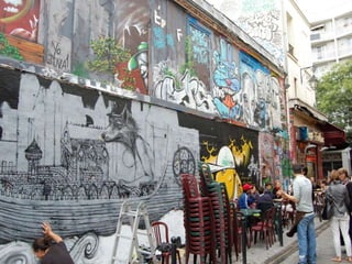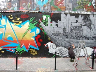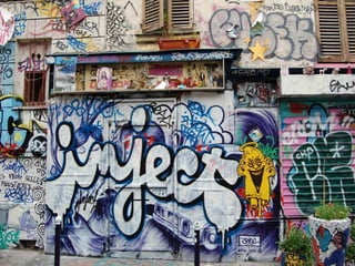 Документ описывает культурную атмосферу Парижа, особенно в районе Центра Помпиду и его окрестностях, где начинающие художники и уличные исполнители создают живую художественную среду. Упоминается разнообразие уличных искусств, включая граффити, перформансы и творчество, а также замечательная архитектура самого Центра Помпиду, известного своими яркими трубами. Автор отмечает значимость традиций и творческой активности в Париже, подчеркивая богатство культурной жизни города.