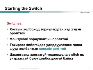 Switch-ийн тохиргоо provides an overview of starting and configuring a Cisco Catalyst switch. It discusses connecting to the switch console, understanding the default configuration, and verifying switch settings. The document also covers configuring features like IP addresses, VLANs, port settings, and managing the MAC address table.