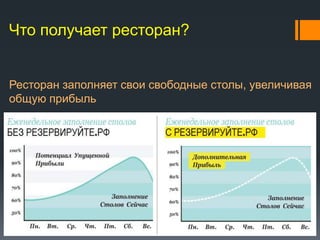 Резервируйте.рф - это сервис онлайн бронирования столов в ресторанах, предлагающий скидку 30% и позволяющий ресторанам заполнить свободные места для увеличения прибыли. Пользователи получают возможность удобно находить рестораны и экономить без использования купонов. На данный момент сервис работает 7 месяцев, имеет 215 ресторанов и 4,200 зарегистрированных пользователей.
