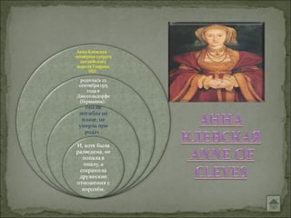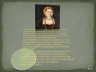 Документ охватывает жизнь шести жён Генриха VIII, фокусируясь на их влиянии на английскую церковь и политику. Анна Болейн, первая жена, привела к разрыву с Римом и основанию англиканской церкви, но была казнена. Кэтрин Говард и другие жёны также подверглись обвинениям в измене, что отражает нестабильность двора и религиозные противоречия того времени.