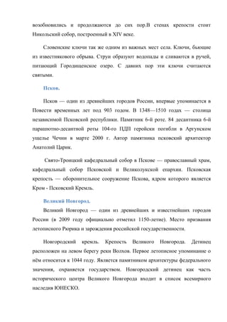 Документ описывает виртуальное путешествие автора по истории и культурным достопримечательностям России, включая такие города, как Великие Луки, Псков, Великий Новгород и Санкт-Петербург. Упоминаются важные исторические и архитектурные объекты, такие как крепости, соборы и музеи, с акцентом на их значимость и культурное наследие. Автор делится личными впечатлениями от посещения Санкт-Петербурга, включая Эрмитаж и Петергоф.