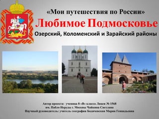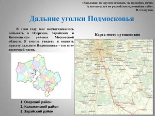 Документ описывает путешествие автора по озерскому, коломенскому и зарайскому районам Московской области. В нем представлены географические данные о районах, их культурные и исторические достопримечательности, а также впечатления от природы и отдыха в санаториях. Автор подчеркивает важность сохранения природного и культурного наследия Подмосковья.