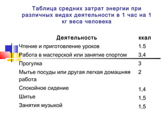 Лабораторная работа посвящена определению изменения веса тела в зависимости от пищевого рациона и энергозатрат. Документ содержит таблицы с данными о расходе и приходе калорий на основе разных видов деятельности и продуктов. В выводах приводится пример расчета изменения веса тела за день.