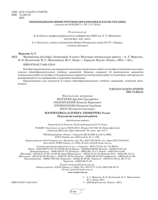 Документ представляет собой методическое пособие для проведения итоговых контрольных работ по алгебре и геометрии для 8 класса общеобразовательных учреждений. В нем содержится 15 равноценных вариантов контрольных работ по каждой дисциплине, а также методические рекомендации и критерии оценивания. Пособие ориентировано на учащихся и учителей математики, включая таблицы для оценки учебных достижений.