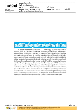 23326 วันที่: พุธ 8 มีนาคม 2560 Section: First Section/การศึกษา หน้า: 13(ล่างซ้าย) ภาพข่าว: ทุกวันพฤหัสบดีที่ รร.บ้านห้วยสาร สังกัด สพป.กระบี่ รหัสข่าว: C-170308021061(8 มี.ค. 60/06:09) หน้า: 1/1 Siam Rath Circulation: 900,000 Ad Rate: 1,050 Col.Inch: 6.55 Ad Value: 6,877.50 PRValue : 20,632.50 คลิป: สี่สี(x3)
