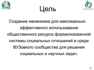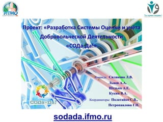 Проект 'Сода-да!' направлен на разработку системы оценки и учета добровольческой деятельности в вузах для эффективного использования общественного ресурса. Основная цель проекта заключается в формализации внеучебной деятельности студентов и аспирантов, оптимизации их социальной активности, а также в обеспечении устойчивого развития через сотрудничество с различными организациями. Ожидается, что реализация проекта повысит профессиональные навыки студентов и сформирует положительный имидж добровольчества в России.