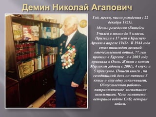 Документ рассказывает о жизни Николая Агаповича, который родился 22 декабря 1925 года в Витебске и стал инвалидом Великой Отечественной войны. Он является автором нескольких книг, активно участвует в общественной работе и воспитывает внуков и правнуков. Николай также имеет множество наград за свою службу и трудовую деятельность, а его жизненный опыт подчеркивает важность сохранения истории.