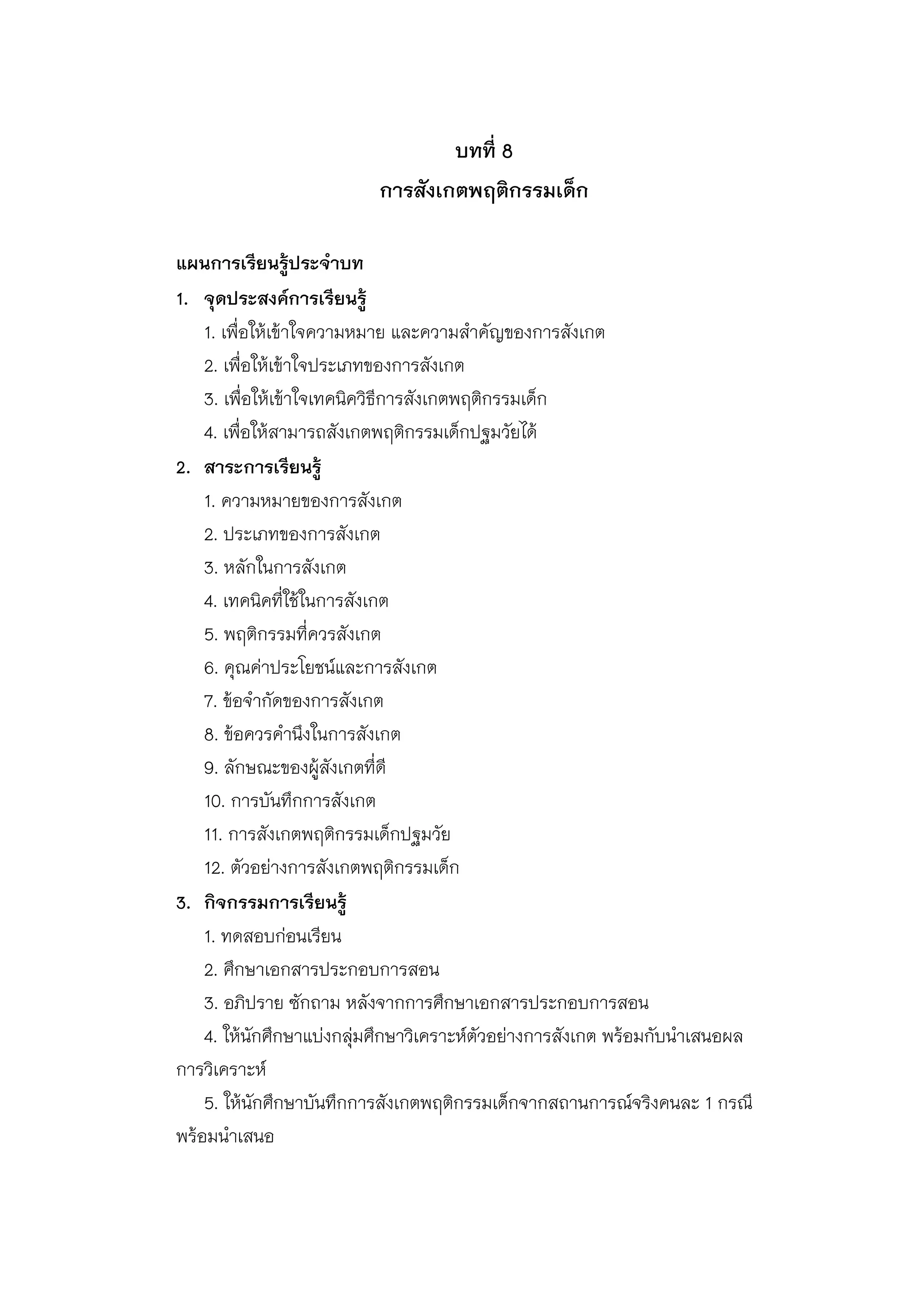 เพื่อให้เข้าใจความหมาย และความสาคัญของการสังเกต 2. เพื่อให้เข้าใจประเภทของการสังเกต 3. เพื่อให้เข้าใจเทคนิควิธีการสังเกตพฤติกรรมเด็ก 4. เพื่อให้สามารถสังเกตพฤติกรรมเด็กปฐมวัยได้ 2. สาระการเรียนรู้ 1. ความหมายของการสังเกต 2. ประเภทของการสังเกต 3. หลักในการสังเกต 4. เทคนิคที่ใช้ในการสังเกต 5. พฤติกรรมที่ควรสังเกต 6. คุณค่าประโยชน์และการสังเกต 7. ข้อจากัดของการสังเกต 8. ข้อควรคานึงในการสังเกต 9. ลักษณะของผู้สังเกตที่ดี 10. การบันทึกการสังเกต 11. การสังเกตพฤติกรรมเด็กปฐมวัย 12. ตัวอย่างการสังเกตพฤติกรรมเด็ก 3. กิจกรรมการเรียนรู้ 1. ทดสอบก่อนเรียน 2. ศึกษาเอกสารประกอบการสอน 3. อภิปราย ซักถาม หลังจากการศึกษาเอกสารประกอบการสอน 4. ให้นักศึกษาแบ่งกลุ่มศึกษาวิเคราะห์ตัวอย่างการสังเกต พร้อมกับนาเสนอผล การวิเคราะห์ 5. ให้นักศึกษาบันทึกการสังเกตพฤติกรรมเด็กจากสถานการณ์จริงคนละ 1 กรณี พร้อมนาเสนอ