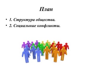 Документ описывает структуру общества, включая социальные группы, статусы и роли, а также важные социальные институты. Он также рассматривает социальные конфликты, их типы и причины, а также возможные способы разрешения конфликтов. Важными пунктами являются компромиссы, переговоры и влияние внешних факторов на разрешение конфликтов.