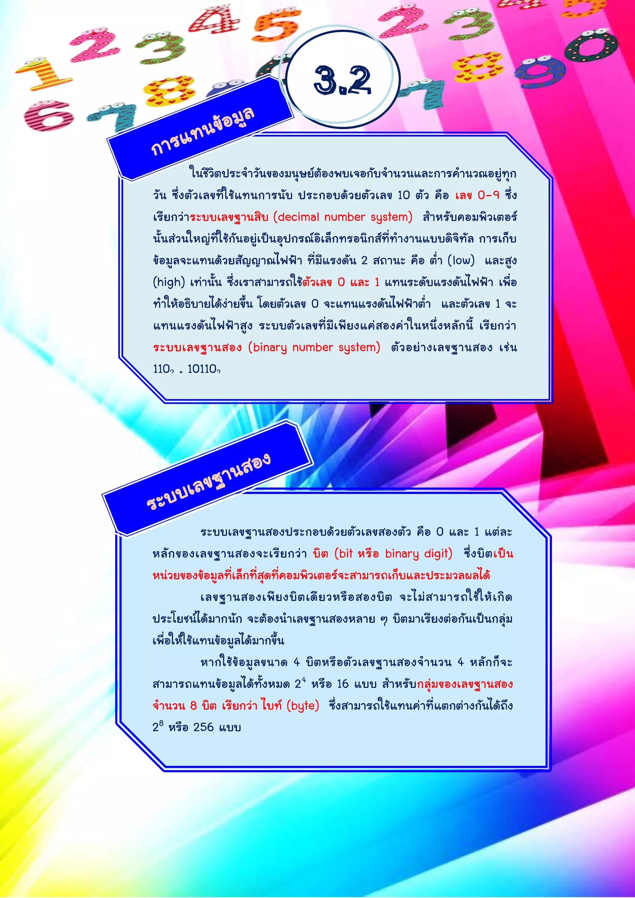 10 ตัว คือ เลข 0-9 ซึ่ง เรียกว่ำระบบเลขฐำนสิบ (decimal number system) สำหรับคอมพิวเตอร์ นั้นส่วนใหญ่ที่ใช้กันอยู่เป็นอุปกรณ์อิเล็กทรอนิกส์ที่ทำงำนแบบดิจิทัล กำรเก็บ ข้อมูลจะแทนด้วยสัญญำณไฟฟ้ำ ที่มีแรงดัน 2 สถำนะ คือ ต่ำ (low) และสูง (high) เท่ำนั้น ซึ่งเรำสำมำรถใช้ตัวเลข 0 และ 1 แทนระดับแรงดันไฟฟ้ำ เพื่อ ทำให้อธิบำยได้ง่ำยขึ้น โดยตัวเลข 0 จะแทนแรงดันไฟฟ้ำต่ำ และตัวเลข 1 จะ แทนแรงดันไฟฟ้ำสูง ระบบตัวเลขที่มีเพียงแค่สองค่ำในหนึ่งหลักนี้ เรียกว่ำ ระบบเลขฐำนสอง (binary number system) ตัวอย่ำงเลขฐำนสอง เช่น 1102 , 101102 ระบบเลขฐำนสองประกอบด้วยตัวเลขสองตัว คือ 0 และ 1 แต่ละ หลักของเลขฐำนสองจะเรียกว่ำ บิต (bit หรือ binary digit) ซึ่งบิตเป็น หน่วยของข้อมูลที่เล็กที่สุดที่คอมพิวเตอร์จะสำมำรถเก็บและประมวลผลได้ เลขฐำนสองเพียงบิตเดียวหรือสองบิต จะไม่สำมำรถใช้ให้เกิด ประโยชน์ได้มำกนัก จะต้องนำเลขฐำนสองหลำย ๆ บิตมำเรียงต่อกันเป็นกลุ่ม เพื่อให้ใช้แทนข้อมูลได้มำกขึ้น หำกใช้ข้อมูลขนำด 4 บิตหรือตัวเลขฐำนสองจำนวน 4 หลักก็จะ สำมำรถแทนข้อมูลได้ทั้งหมด 24 หรือ 16 แบบ สำหรับกลุ่มของเลขฐำนสอง จำนวน 8 บิต เรียกว่ำ ไบท์ (byte) ซึ่งสำมำรถใช้แทนค่ำที่แตกต่ำงกันได้ถึง 28 หรือ 256 แบบ