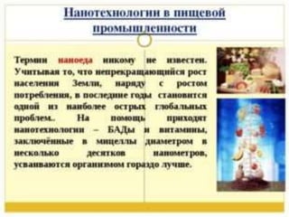 Нанотехнологии представляют собой передовую область науки, включающую создание материалов и устройств на нанометровом уровне, что значительно улучшает их физические и химические свойства. Эти технологии имеют широкий спектр применения, в том числе в медицине, где используются для разработки наномашин, нанокомпьютеров и методов лечения различных заболеваний. Кроме того, нанотехнологии находят свое применение в косметике и производстве продуктов питания, повышая их эффективность и свойства.