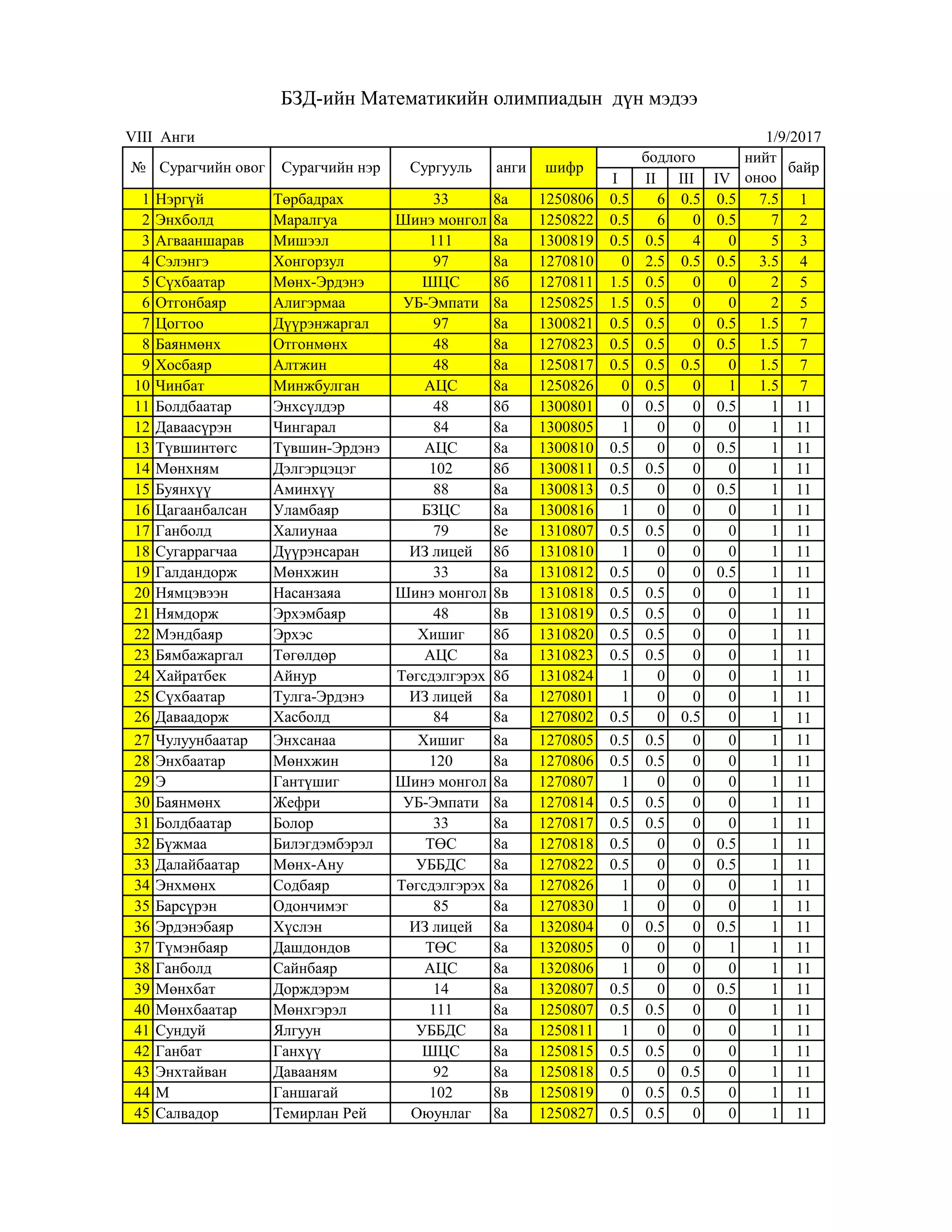 IV 1 Нэргүй Төрбадрах 33 8а 1250806 0.5 6 0.5 0.5 7.5 1 2 Энхболд Маралгуа Шинэ монгол 8а 1250822 0.5 6 0 0.5 7 2 3 Агвааншарав Мишээл 111 8а 1300819 0.5 0.5 4 0 5 3 4 Сэлэнгэ Хонгорзул 97 8а 1270810 0 2.5 0.5 0.5 3.5 4 5 Сүхбаатар Мөнх-Эрдэнэ ШЦС 8б 1270811 1.5 0.5 0 0 2 5 6 Отгонбаяр Алигэрмаа УБ-Эмпати 8а 1250825 1.5 0.5 0 0 2 5 7 Цогтоо Дүүрэнжаргал 97 8а 1300821 0.5 0.5 0 0.5 1.5 7 8 Баянмөнх Отгонмөнх 48 8а 1270823 0.5 0.5 0 0.5 1.5 7 9 Хосбаяр Алтжин 48 8а 1250817 0.5 0.5 0.5 0 1.5 7 10 Чинбат Минжбулган АЦС 8а 1250826 0 0.5 0 1 1.5 7 11 Болдбаатар Энхсүлдэр 48 8б 1300801 0 0.5 0 0.5 1 11 12 Даваасүрэн Чингарал 84 8а 1300805 1 0 0 0 1 11 13 Түвшинтөгс Түвшин-Эрдэнэ АЦС 8а 1300810 0.5 0 0 0.5 1 11 14 Мөнхням Дэлгэрцэцэг 102 8б 1300811 0.5 0.5 0 0 1 11 15 Буянхүү Аминхүү 88 8а 1300813 0.5 0 0 0.5 1 11 16 Цагаанбалсан Уламбаяр БЗЦС 8а 1300816 1 0 0 0 1 11 17 Ганболд Халиунаа 79 8е 1310807 0.5 0.5 0 0 1 11 18 Сугаррагчаа Дүүрэнсаран ИЗ лицей 8б 1310810 1 0 0 0 1 11 19 Галдандорж Мөнхжин 33 8а 1310812 0.5 0 0 0.5 1 11 20 Нямцэвээн Насанзаяа Шинэ монгол 8в 1310818 0.5 0.5 0 0 1 11 21 Нямдорж Эрхэмбаяр 48 8в 1310819 0.5 0.5 0 0 1 11 22 Мэндбаяр Эрхэс Хишиг 8б 1310820 0.5 0.5 0 0 1 11 23 Бямбажаргал Төгөлдөр АЦС 8а 1310823 0.5 0.5 0 0 1 11 24 Хайратбек Айнур Төгсдэлгэрэх 8б 1310824 1 0 0 0 1 11 25 Сүхбаатар Тулга-Эрдэнэ ИЗ лицей 8а 1270801 1 0 0 0 1 11 26 Даваадорж Хасболд 84 8а 1270802 0.5 0 0.5 0 1 11 27 Чулуунбаатар Энхсанаа Хишиг 8а 1270805 0.5 0.5 0 0 1 11 28 Энхбаатар Мөнхжин 120 8а 1270806 0.5 0.5 0 0 1 11 29 Э Гантүшиг Шинэ монгол 8а 1270807 1 0 0 0 1 11 30 Баянмөнх Жефри УБ-Эмпати 8а 1270814 0.5 0.5 0 0 1 11 31 Болдбаатар Болор 33 8а 1270817 0.5 0.5 0 0 1 11 32 Бүжмаа Билэгдэмбэрэл ТӨС 8а 1270818 0.5 0 0 0.5 1 11 33 Далайбаатар Мөнх-Ану УББДС 8а 1270822 0.5 0 0 0.5 1 11 34 Энхмөнх Содбаяр Төгсдэлгэрэх 8а 1270826 1 0 0 0 1 11 35 Барсүрэн Одончимэг 85 8а 1270830 1 0 0 0 1 11 36 Эрдэнэбаяр Хүслэн ИЗ лицей 8а 1320804 0 0.5 0 0.5 1 11 37 Түмэнбаяр Дашдондов ТӨС 8а 1320805 0 0 0 1 1 11 38 Ганболд Сайнбаяр АЦС 8а 1320806 1 0 0 0 1 11 39 Мөнхбат Дорждэрэм 14 8а 1320807 0.5 0 0 0.5 1 11 40 Мөнхбаатар Мөнхгэрэл 111 8а 1250807 0.5 0.5 0 0 1 11 41 Сундуй Ялгуун УББДС 8а 1250811 1 0 0 0 1 11 42 Ганбат Ганхүү ШЦС 8а 1250815 0.5 0.5 0 0 1 11 43 Энхтайван Давааням 92 8а 1250818 0.5 0 0.5 0 1 11 44 М Ганшагай 102 8в 1250819 0 0.5 0.5 0 1 11 45 Салвадор Темирлан Рей Оюунлаг 8а 1250827 0.5 0.5 0 0 1 11 шифр БЗД-ийн Математикийн олимпиадын дүн мэдээ VIII Анги 1/9/2017 бодлого нийт оноо байр№ Сурагчийн овог Сурагчийн нэр Сургууль анги