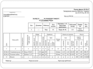 Рік Місяць Сільгосп- підприємство Шифр Від- діленняБригада ОБЛІКОВИЙ ЛИСТ №................ ТРАКТОРИСТА - МАШИНІСТА Прізвище, ім`я, по батькові тракториста машиніста Професія Категорія Табельний номер Марка машини Шифр марки машини Інвен- тарний номер Числамісяця №поля Найменування культури та виконаної роботи, склад агрегату Агротехнічні умови виконаної роботи Бригада-замовник Шифрсинтетичногота аналітичногообліку роботи Одиницявиміру Відробленогодин Нормавиробітку Розцінка Змінаеталона виробітку Фактично виконано Оплата праці Витрата палива По нормі фактично Унатурі Вперекладі наумовніга Зміннихнорм Основна Додаткова усього Наодиницю роботи усього 10%