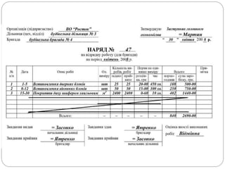 Прізвище, ім'я ,по батькові Про- фесія Кате- горія Табель- ний номер Го- дини Обсяг викона- ної роботи Сума Го- дини Обсяг викона- ної роботи Сума Го- дини Обсяг викона- ної роботи Сума Всього відпрацьовано сума годин днів Рік Мі – сяць Сільгосппідприємство Шифр Відділення (дільниця, цех) Ферма Бригада Ланка ОБЛІКОВИЙ ЛИСТ №_____ ПРАЦІ І ВИКОНАНИХ РОБІТ Числа місяця.............................................. Бригадир _________________ прізвище _____________ ім’я, по батькові Бригада – замовник................................... Шифр синтетичного та аналітичного обліку праці................................................ Назва культури і виконаної роботи.......... Одиниця виміру і шифр............................ Розцінка....................................................... Норма виробітку........................................