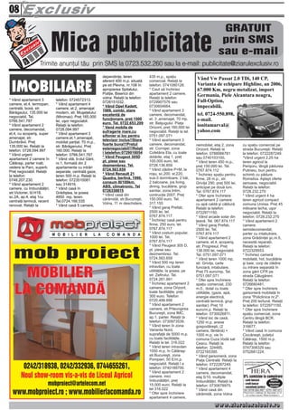 Documentul conține o serie de anunțuri de mică publicitate, în principal despre vânzări și închirieri de imobile și terenuri. Acesta include detalii despre apartamente, case, mașini și alte bunuri, precum și date de contact pentru fiecare ofertă. Anunțurile sunt diverse și acoperă o gamă largă de oferte și prețuri.