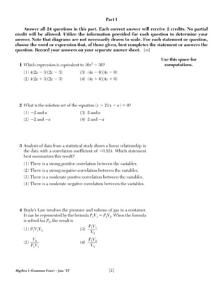 The document is an examination for Algebra I (Common Core). It contains instructions for students taking the exam, informing them that it has four parts with a total of 37 multiple-choice questions. Students must show all work directly in the booklet provided and are not permitted to use scrap paper. They must have a graphing calculator and straightedge available during the exam. The first 24 questions are multiple choice, with each correct answer receiving 2 credits. Questions test students on concepts like linear equations, functions, exponential growth, and completing the square.