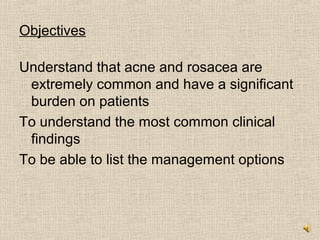 Acne and rosacea are extremely common skin conditions that can have a significant psychological and social impact. Acne is caused by factors like blocked hair follicles, increased sebum production, inflammation, bacteria, and hormones. Rosacea has different clinical forms including papules/pustules and redness/telangiectasias. Both are managed with topical treatments like retinoids, antibiotics, and oral antibiotics/isotretinoin for more severe cases. Patients require long-term treatment to control symptoms.