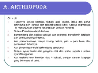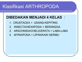 Dokumen ini menjelaskan tentang ciri-ciri dan klasifikasi arthropoda, yang terbagi menjadi empat kelas: Crustacea, Insecta, Arachnida, dan Myriapoda. Setiap kelas memiliki karakteristik unik serta peran ekologis dan dampak bagi manusia. Selain itu, dokumen juga mencakup tujuan pembelajaran tentang organisasi kehidupan dan interaksi dalam ekosistem.